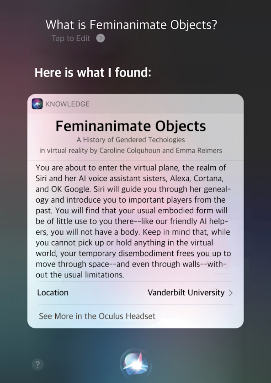 Tracing the (abridged) history of Alexa and Siri’s ancestors, we examine the feminization of technological infrastructures and the objectification of the feminine and its implications in past, present, and future. In building our VR experience, we experienced many technical limitations, time constraints, and lots of bugs that needed to go or, in one case, evolved to become a feature.