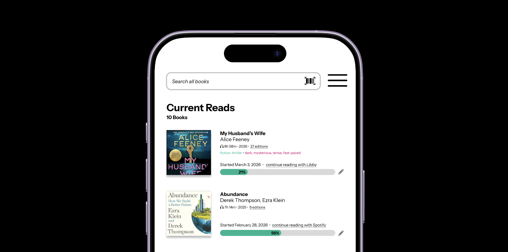 I have performed a few small, high-impact revisions to StoryGraph’s interface and basic functions. An update to its main menu, refresh of its edit feature for current books, and facelift of its challenges page allow for users to continue to receive the wealth of insights on their reading they so love while being less hindered by the in-app interactions.