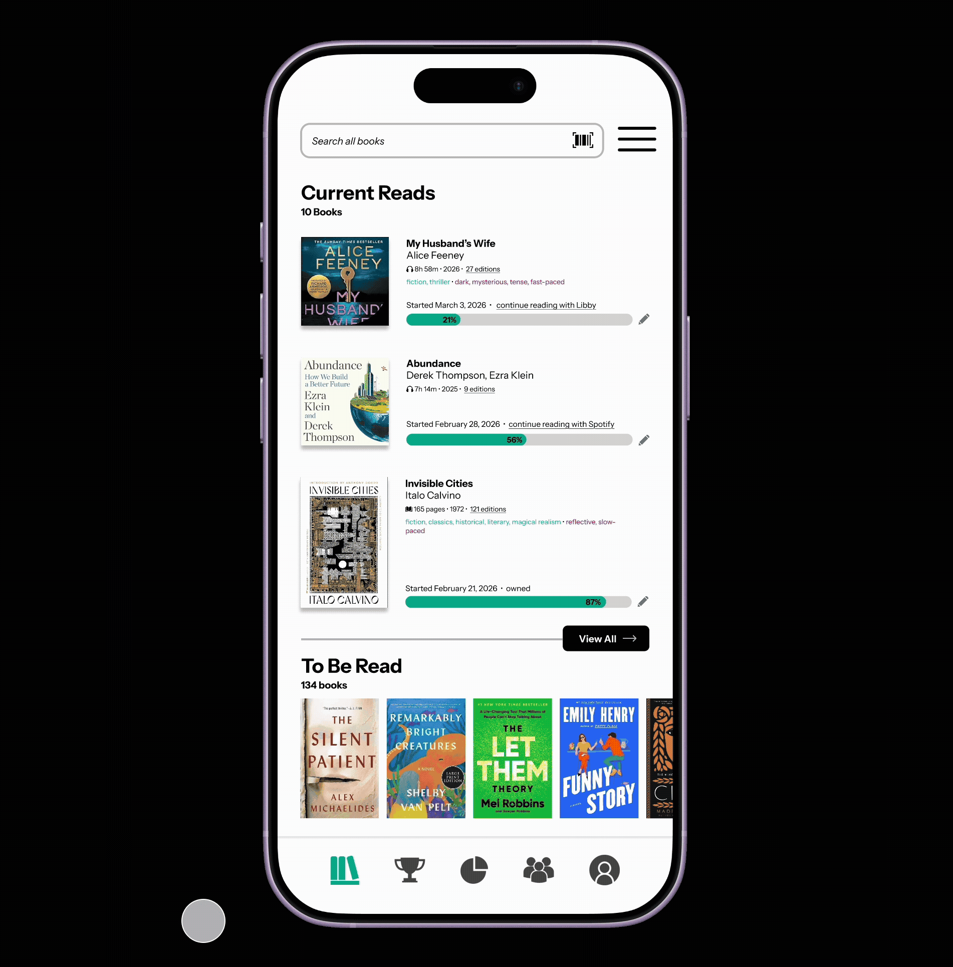 Removing the horizontal shelf allows for greater detail to be displayed. If the purpose of the home page is to show a quick view of the most recently interacted-with current reads, a horizontal visual shelf provides too little information to be meaningful for the user. A detailed view with editing capabilities is more useful. The view all button remains as I suggest limiting the current reads view to 3 initial books or audiobooks.