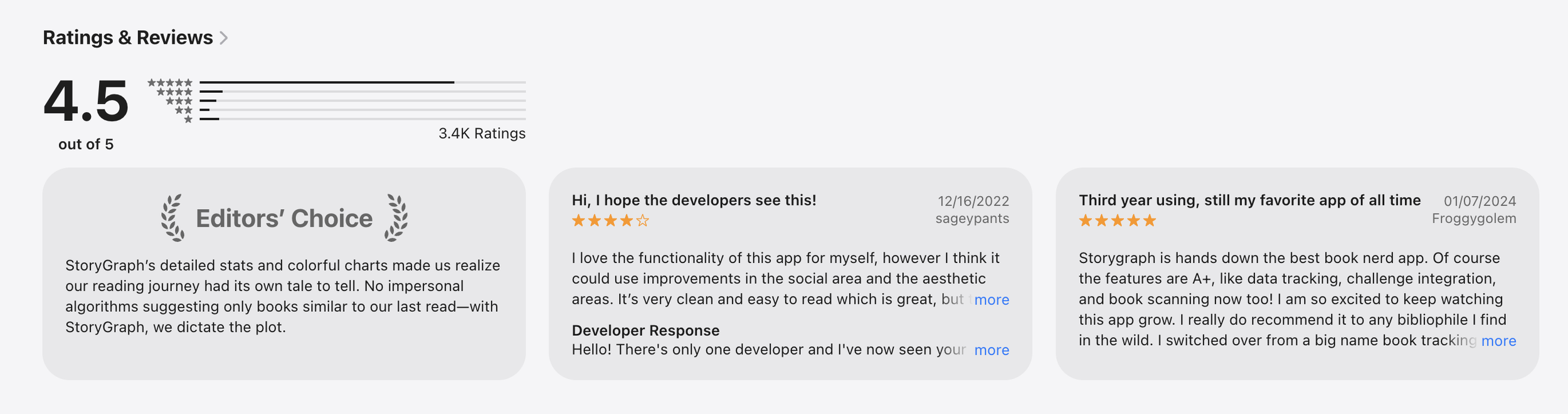 StoryGraph has overall received positive reviews, which supports my personal experience as a user of the app. I know the team is small (3 people with only one founding developer) so I understand there are probably a lot of things on their fix-it list — and perhaps I’ve even hit a few of them.