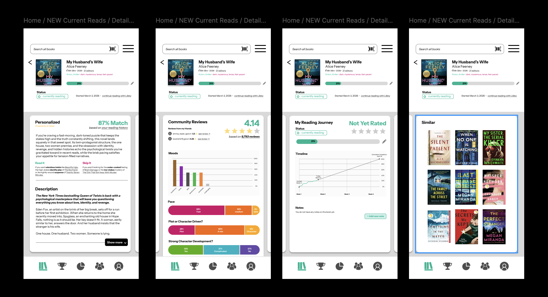 The latest update to StoryGraph brought some welcome revisions to the visualization of the key questions asked in the book review process, showing them as percentages of a bar graph. While this provides some improvement, there is still much to be done about the wordy description section and the AI description (notably in beta) to make these useful to the customer. Instead of a long scroll function, I recommend breaking the information into distinct cards and including a personal reading journey to visualize the notes and timeline of reading a particular book.
